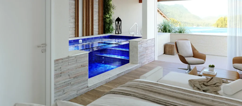 Você pode configurar sua piscina com acessórios incríveis, como: Transparência, Aquecimento, Fibra Ótica (fundo estrelado), Cascatas, Pedras Naturais para a borda (iGUi STONE), interatividade (Eletronic System), entre várias outras possibilidades.